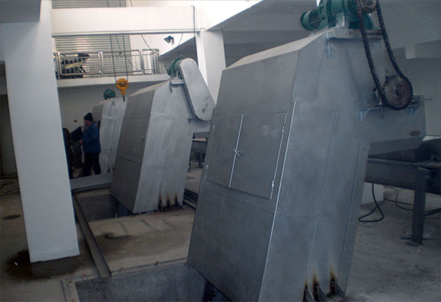 CF-Ⅰ型回轉(zhuǎn)式固液分離機(jī)采用回轉(zhuǎn)式,由一種特殊形狀的犁形耙齒按一定的裝配順序和數(shù)量排列在橫軸上,組成耙齒鏈,根據(jù)過水流量,裝配成不同的間隙,安裝在泵站或水處理系統(tǒng)的入口處,當(dāng)驅(qū)動(dòng)裝置帶動(dòng)耙齒自下向上運(yùn)動(dòng)時(shí),水中的雜物被耙齒撈起,液體則在柵隙中流過,設(shè)備轉(zhuǎn)動(dòng)到上部頂點(diǎn)后,耙齒鏈改變運(yùn)動(dòng)方向,由上向下運(yùn)動(dòng),物料依靠自重從耙齒上自動(dòng)脫落,當(dāng)耙齒從反面轉(zhuǎn)到設(shè)備底部時(shí),又開始另一循環(huán)往復(fù)的連續(xù)運(yùn)行,從而不斷地從水中清撈雜物,達(dá)到固液分離的目的。